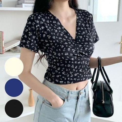 [에이치플러스몰]여름 반팔티 캐주얼 크롭 여자 필수템 슬림 꽃무늬 V