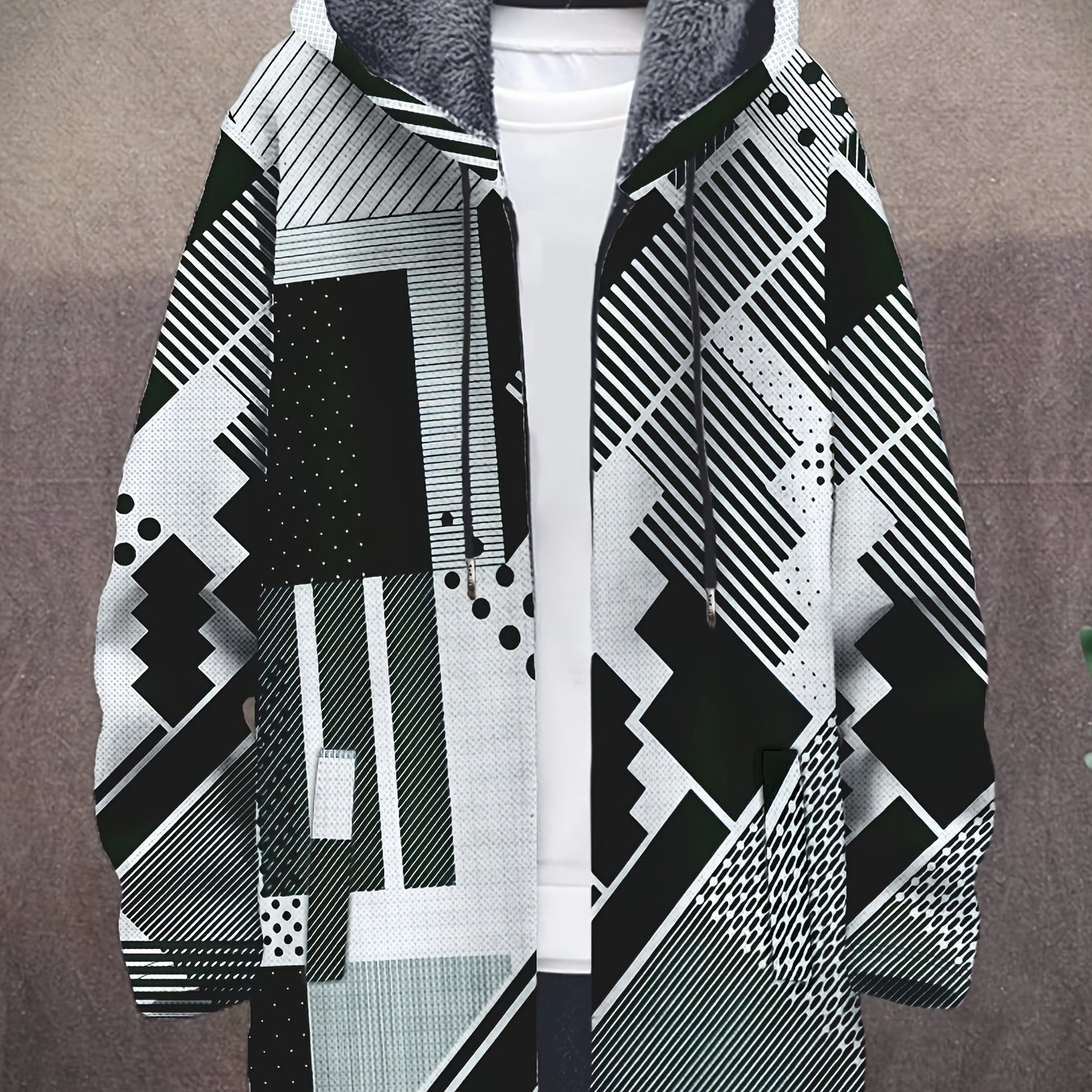 TEMU 남성용 3D 프린팅 패션 가디건 코트, 레트로 기하학적 그라데이션 디자인, 플러시 두꺼운 소재, 긴 소매, 지퍼가 달린 따뜻한 후드, 겨울에 완벽