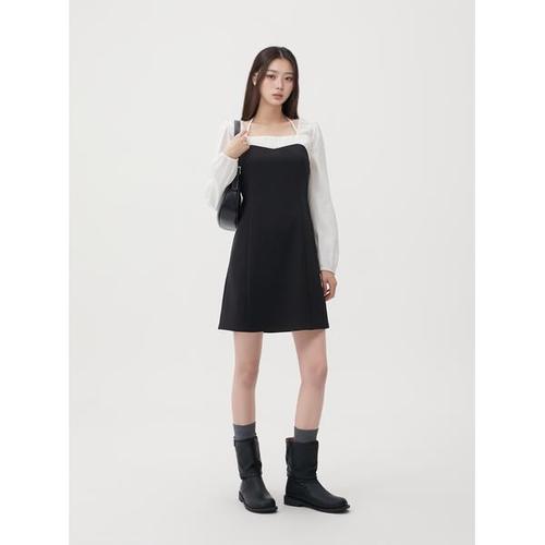 TEMU 2025 신상 롱슬리브 턴칼라 셔츠 + 루즈핏 스파게티 멜빵 드레스, 캐주얼 아웃핏,데일리 패션,우아한 스타일,신축성 없는 원단,맞춤형 디자인,모던 드레서,여성 패션