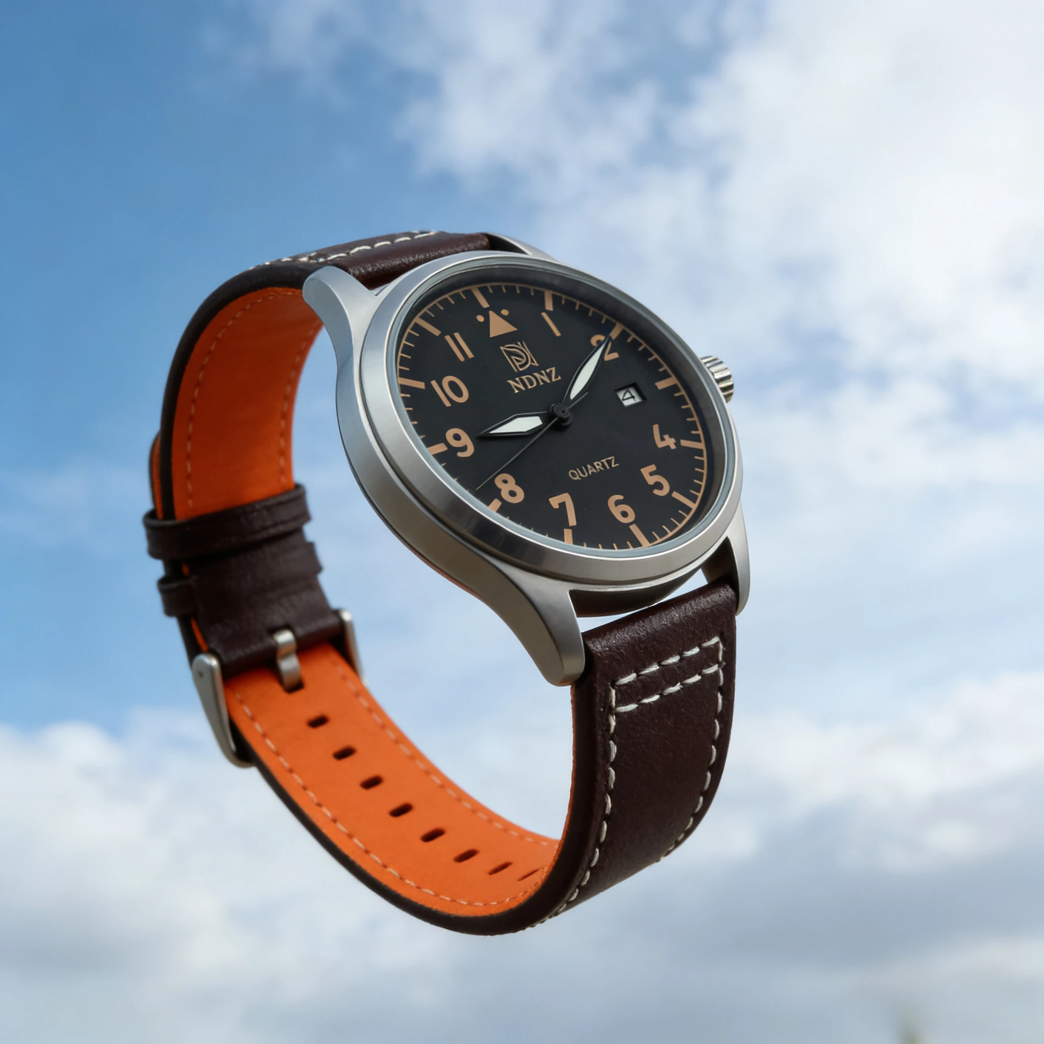 NDNZ 파일럿 쿼츠 시계 레트로 캐주얼 남성용 시계 브라운 가죽 스트랩 비즈니스 남성용 시계