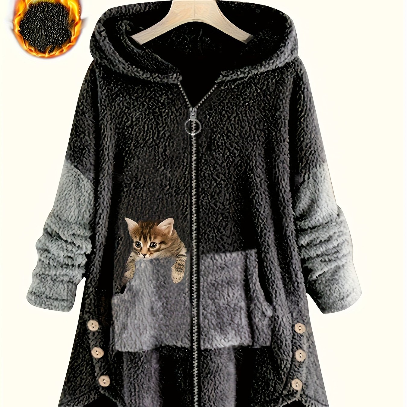TEMU 플러스 사이즈 - 고양이 프린트 컬러 블록 플러시 후드 코트 | 캐주얼 루즈핏 미디 길이 패션 겉옷, 가을용 포켓 포함