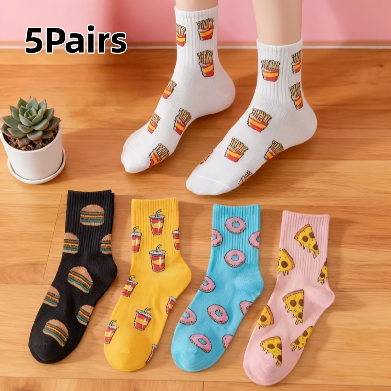 TEMU 여성용 미드 캐프 양말 5팩 - 귀여운 음식 테마(햄버거, 감자튀김, 도넛) & 과일 패턴, 단색, 손세탁 가능, 대학생 스타일 캐주얼 운동 양말, 테마 의상용