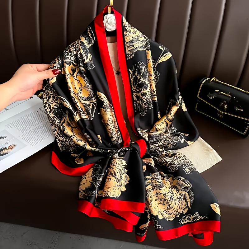 TEMU 35.4인치 화려한 플로럴 프린트 새틴 스퀘어 스카프 - 스타일 & 방풍 통기성 폴리에스터 스카프, 가벼운 여행 및 캐주얼 액세서리, 매끄러운 새틴 마감, 대담한 컬러 컨트라스트, 세련된 외관