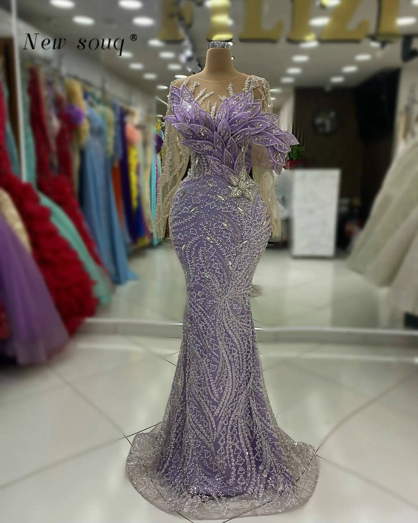 화려한 라일락 퍼플 롱 슬리브 머메이드 이브닝 드레스 2024 크리스탈 비즈 장식 여성용 웨딩 나이트 프롬 파티 가운