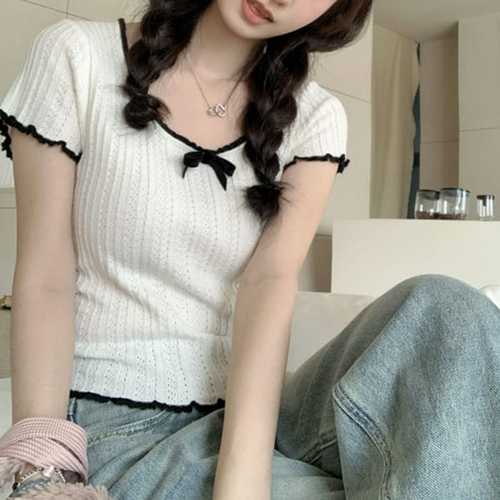 슈팅스타 / 키치 리본 매듭 레이스 U넥 크롭 숏 반소매 크롭티