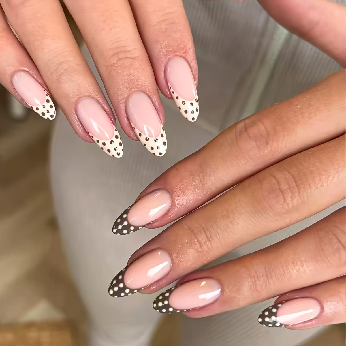 TEMU 10개입 핸드메이드 아몬드형 프레스온 네일 세트, 브라운 & 프렌치 폴카도트 스타일, 우아하고 미니멀, 모든 행사에 적합, 데일리웨어, 웨딩, 재사용 가능한 인조 네일