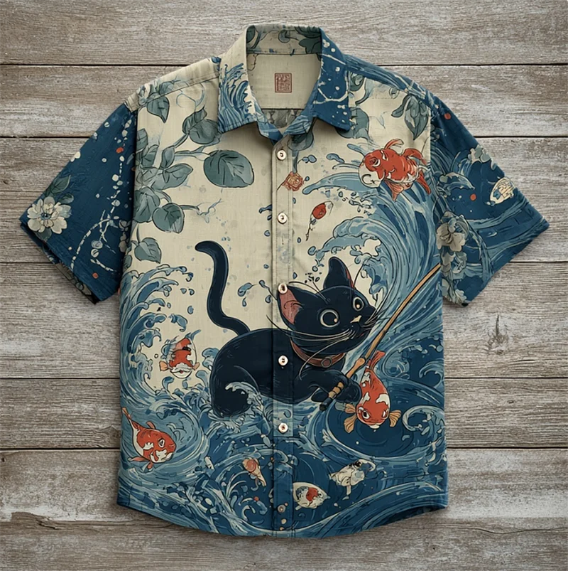 다채로운 남성 리넨 여름 짧은 소매 셔츠 패션, 짧은 소매 탑 3D 고양이 프린트 패턴 남성 의류,