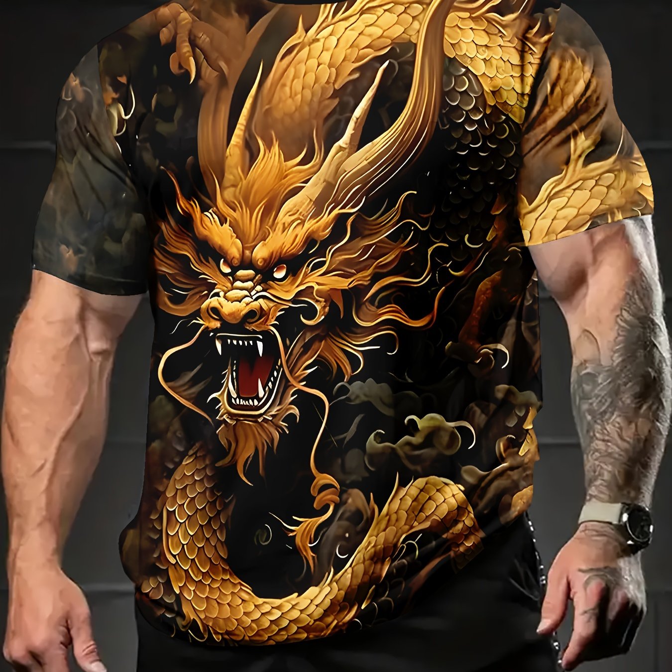 TEMU 남성용 대담한 골든 드래곤 그래픽 티 - 캐주얼 반팔, 라운드 넥, 폴리에스터, 생생한 여름 색상, 세탁기 사용 가능, 캐주얼 여름 착용 | 드래곤 프린트 셔츠 | 생동감 있는 프린트