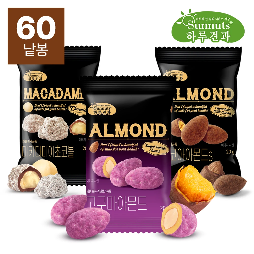 [하루견과] 코코아아몬드20봉+마카다미아초코볼20봉+고구마아몬드20봉 (총60봉) / 맛있는 견과류 / 건강한 간식