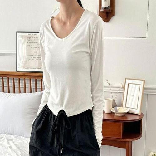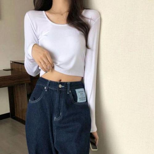 [셀러허브_여성트랜드패션]여자 세미크롭 피치스킨 긴팔 티셔츠 촉감 U넥 소프트