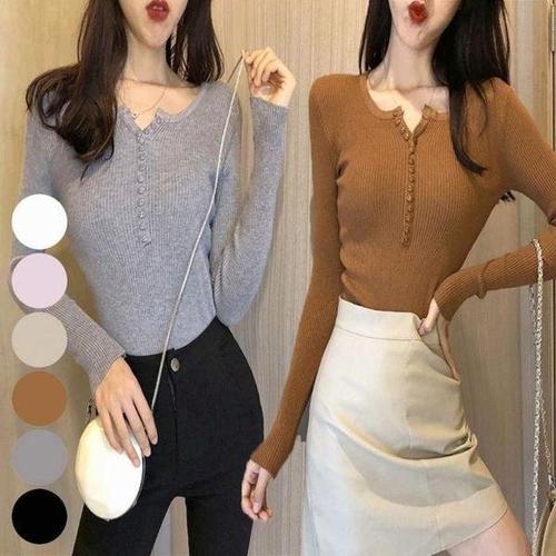 [셀러허브_여성트랜드패션]여자 긴팔 스판 티셔츠 슬림핏단추 잔골지 U넥 긴팔