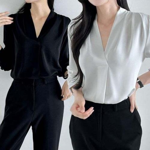 [셀럽하우스]브이넥 HMOA1973 블라우스 데일리 기본 면접 클래식 정장 긴팔