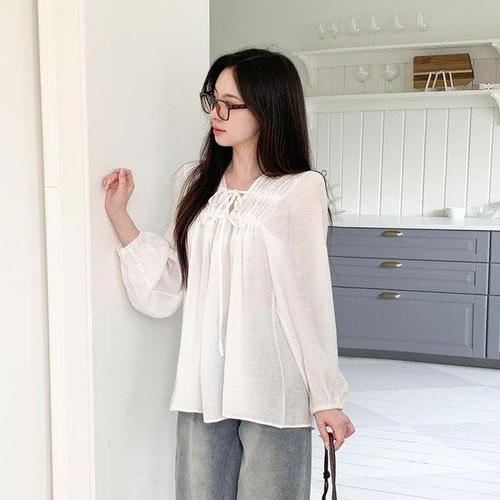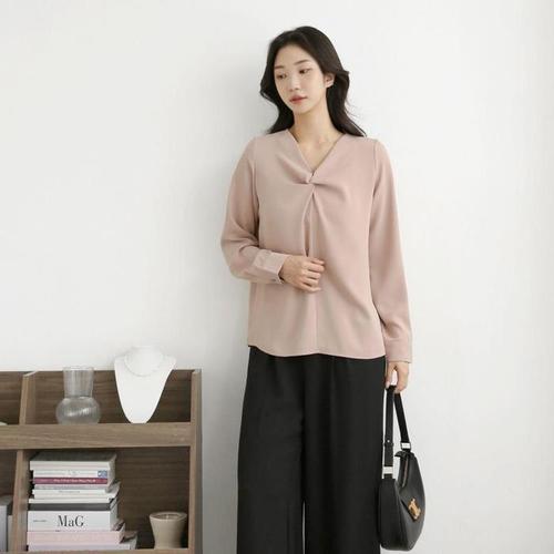 [신상오픈런]여성 기본핏 V넥 트위스트 긴팔 출근용 블라우스