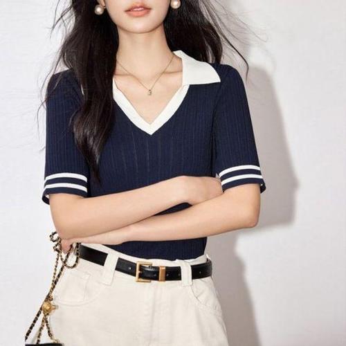 여성 여름철 시원한 쿨 니트 소재 브이넥 반팔티